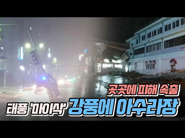 ◀ANC▶태풍 '마이삭'의 영향으로울산에는 밤새 강풍이 몰아쳤습니다.대규모 정전에 간판과 공사장 구조물이 나뒹굴고 가로수가 쓰러지는 등 피해가 속출했습니다.김문희 기자. ◀END▶ ◀VCR▶태풍 '마이삭'이 울산에 가장 근접한오늘(9/3) 새벽.바람이 거세지자 한 편의점 직원이문이 흔들리지 않게 붙잡고 서 있습니...