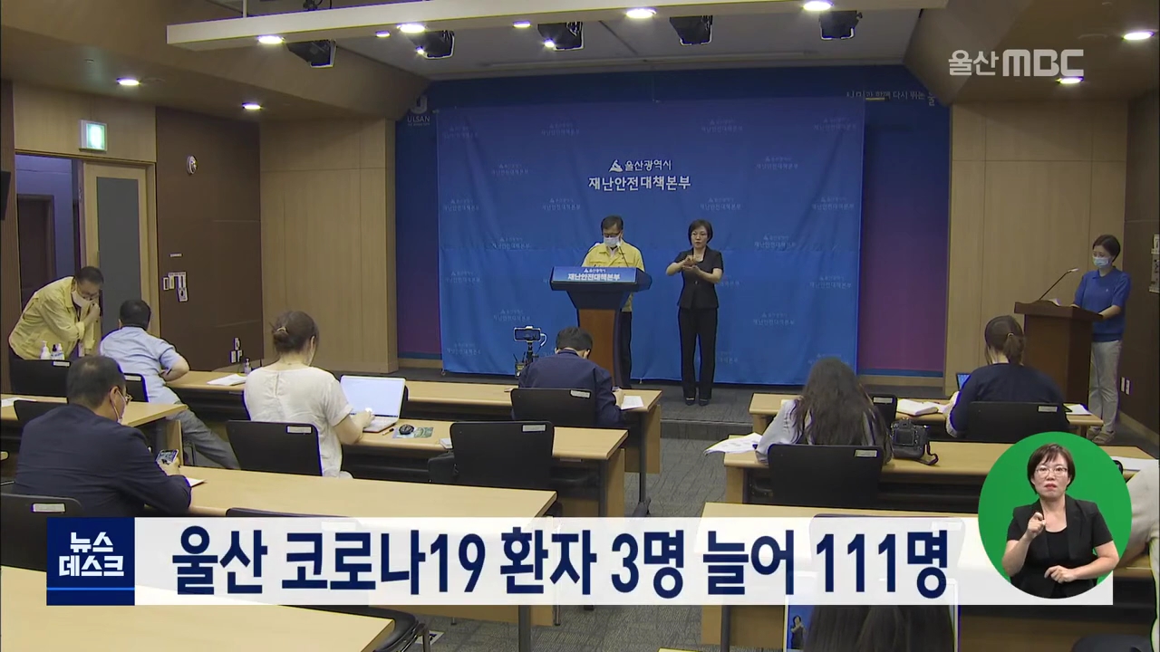 울산의 코로나19 확진 환자는 오늘(9/3) 3명이 추가돼 111명으로 늘었습니다. 현재 43명이 입원 치료를 받고 있으며 환자들의 상태는 모두 양호합니다. 구군 보건소와 KTX 울산역 선별진료소는 태풍 '마이삭'으로 운영을 일시 중단했으며 내일(9/4)부터 검사를 재개할 예정입니다.//