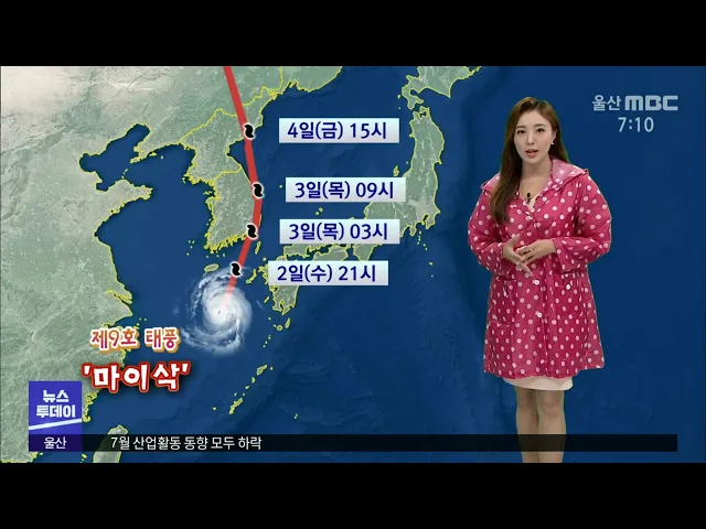 [오늘과 내일 태풍 '마이삭' 영향... 울산 최대 400mm 이상 폭우]1) 현재 울산에는 시간당 5mm 안팎의 비가 내리고 있는데요. 태풍의 직접영향을 받기 전까지 비는 내렸다 그쳤다를 반복하겠고, 국지적으로 천둥번개를 동반한 많은 비가 오는 곳도 있겠습니다. 2) 매우 강한 태풍으로 발달한 '마이삭'은 서귀포 남쪽 해상에...
