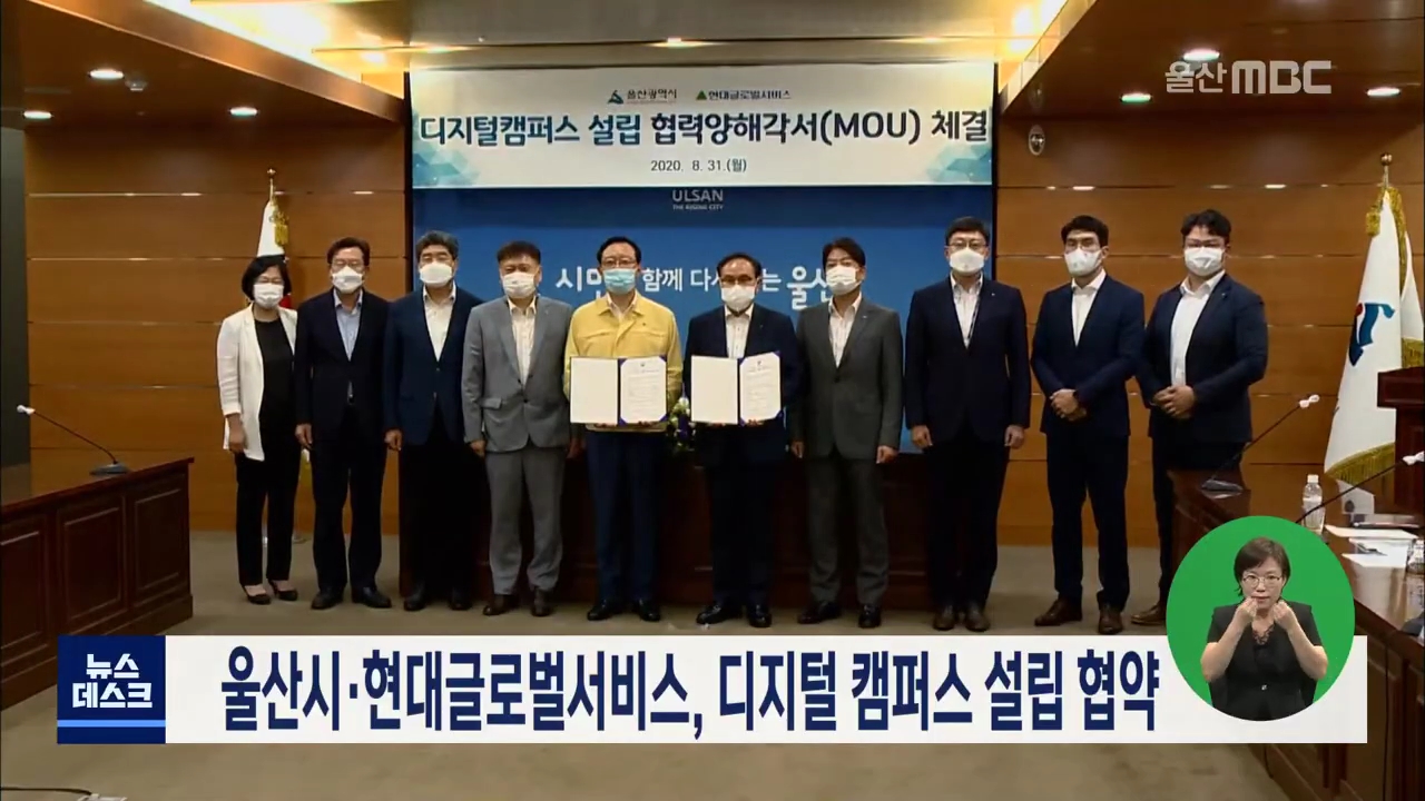 울산시와 현대글로벌서비스는 오늘(8/31) 시청에서 디지털캠퍼스 설립을 위한 업무협약을 체결했습니다. 디지털캠퍼스란 스마트선박과 통합제어, 전기추진 등의 신성장 사업을 위한 제품설계와 연구개발 등을 수행하는 시설입니다. 현대글로벌서비스는 올해 말까지 남구 두왕동 테크노산업단지에 이 시설을 지어 운영할 계...