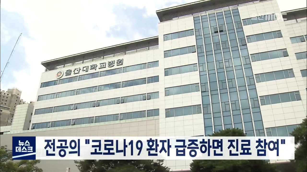 무기한 파업에 들어간 울산대학교병원 전공의들이 코로나19 환자가 급증할 경우 선별진료소 운영과 검체 검사 등 관련 업무에 참여할 것이라고 밝혔습니다. 울산대병원은 파업에 들어간 전공의 121명을 대신해 교수들과 전임의 등 240여명이 진료 업무를 분담해 현재 병원 진료에는 차질이 없다고 밝혔습니다. 오는 26일부...