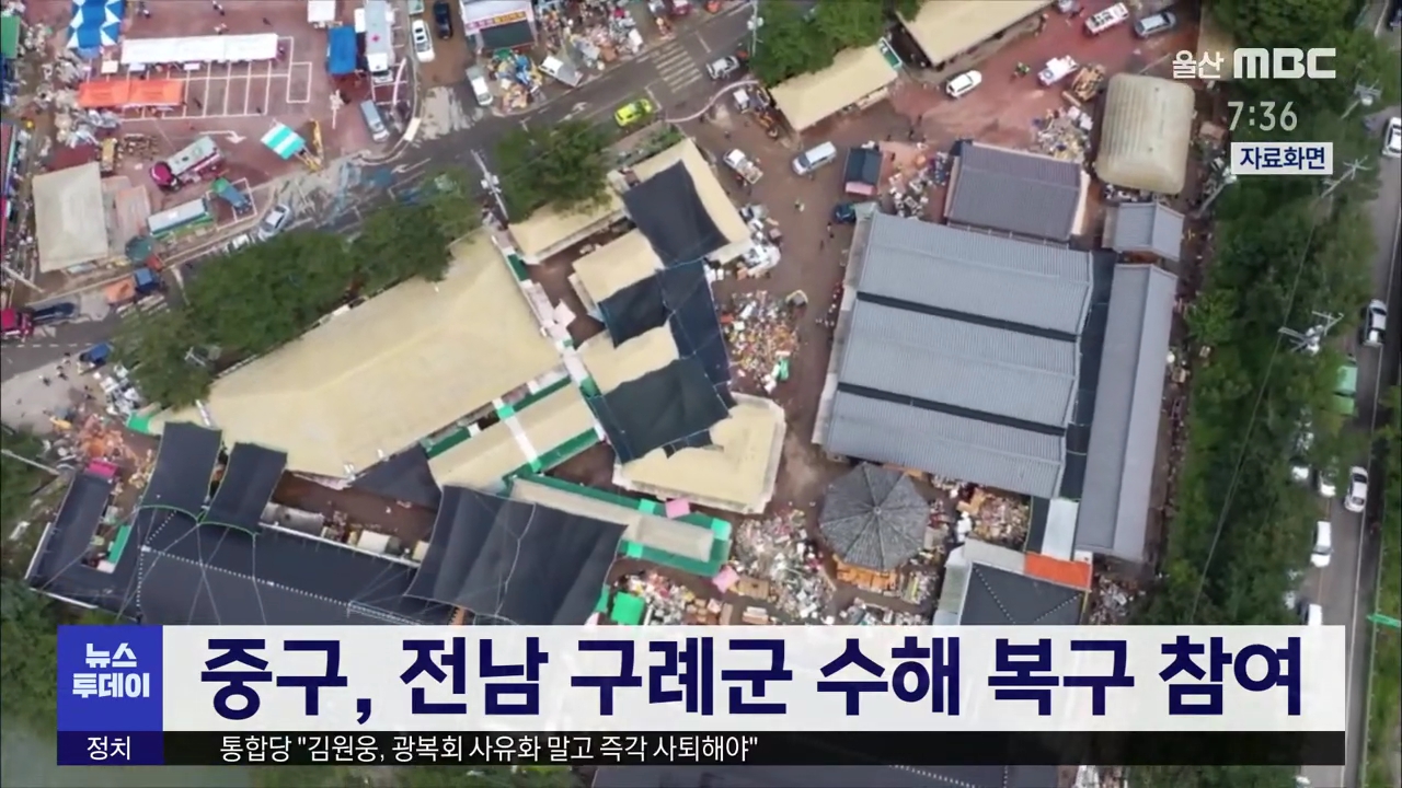 중구는 최근 집중호우로 큰 피해를 입은 전남 구례군을 찾아 상가를 청소하는 등 수해 복구 작업을 도왔다고 밝혔습니다. 중구청은 빠른 시일 내에 피해가 복구되길 바라는 마음을 담아 이재민에게 100만원 상당의 식품 꾸러미를 전달했다고 덧붙였습니다. //