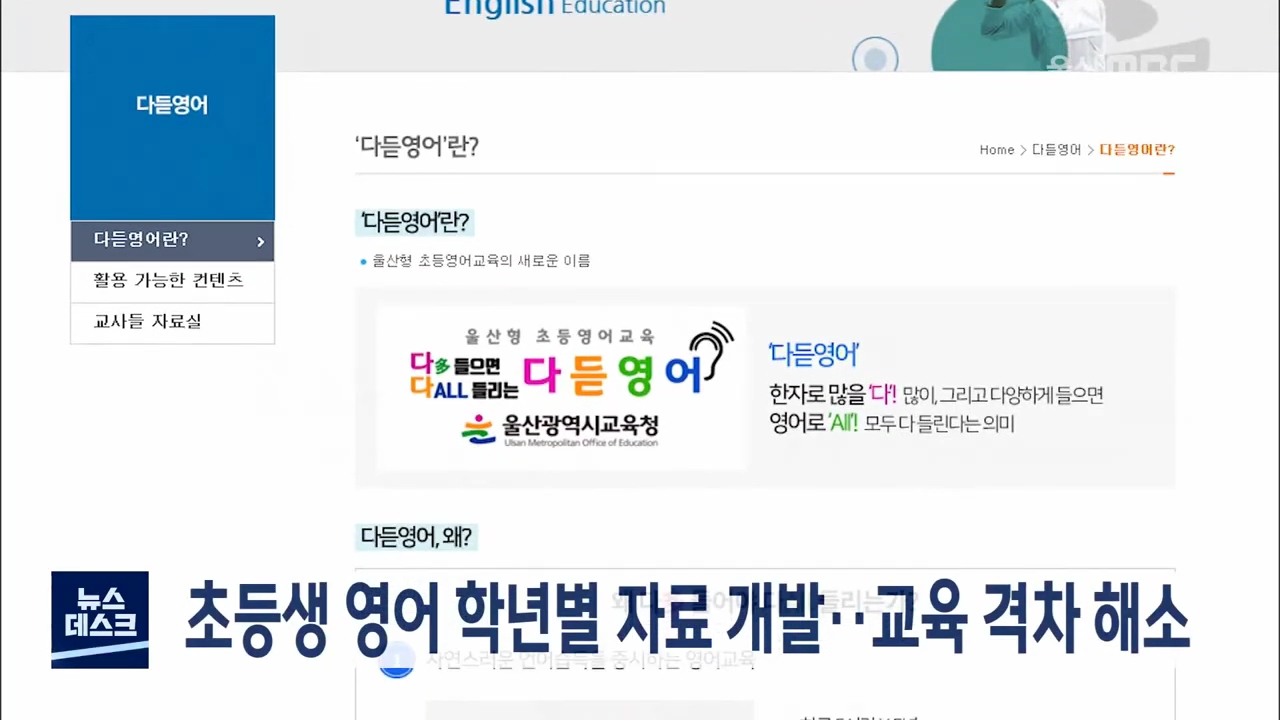 울산시교육청은 초등학생 영어 교육 격차 해소를 위해 학년별 보충학습 자료를 개발합니다. 울산시교육청은 학교 현장의 울산형 초등영어교육 ‘다듣영어’지료로 초등학교 3학년에서 6학년용 학습자료 4종을 제작합니다. 학습자료는 빠르면 오는 9월 전 초등학교에 지원될 예정입니다.
