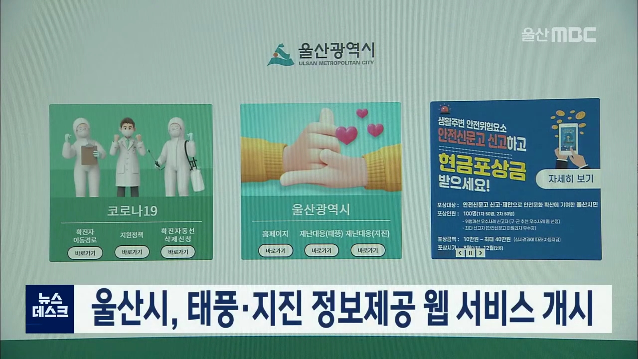 울산시가 자체 홈페이지를 통해 태풍과 지진에 대한 대응 정보를 제공합니다. 울산시는 홈페이지에 '재난 대응 웹' 페이지를 새로 구축해, 지진이나 태풍이 발생했을 때 행동 요령과 주변의 비상대피 시설 등을 안내합니다. 또 평소 재난에 대비하기 위한 사전 준비 요령과 상황별, 장소별 대응 방식 등의 교육 자료도 제공...