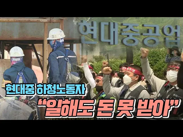 ◀ANC▶현대중공업 하청노동자들이 이번달 월급을 한 푼도 받지 못했다며원청인 현대중공업에 해결을 촉구했습니다.하청업체 21곳이현대중공업이 지급하는 기성금이 적다는 이유로아예 수령을 거부하고직원들 월급을 안 준 겁니다. 정인곤 기자. ◀END▶ ◀VCR▶현대중공업 노조 사내하청 지회가 기자회견을 열고 원청...