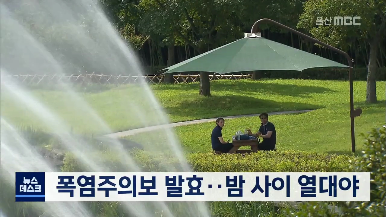 태풍 장미가 지나가자마자 울산에는 곧바로 폭염이 찾아왔습니다. 오늘(8/11) 울산지방은 오전 11시를 기해 폭염주의보가 발효됐으며 한낮에는 32.5도까지 올라 무더웠습니다. 내일은 아침최저기온이 25도로 예보돼 있어 밤사이 열대야가 나타나겠고 낮 최고 기온도 32도를 보이겠습니다. 울산기상대는 오늘 밤부터 내일 밤...