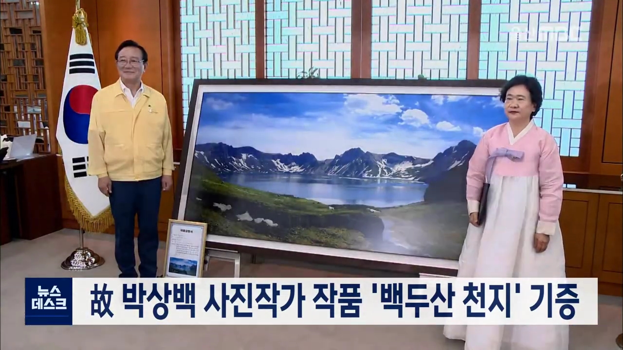 울산 출신 고(故) 박상백 작가의 사진 '백두산 천지'가 울산시에 기증됐습니다. 박 작가의 미망인 김행자 여사는 이 작품이 울산 발전에 정기를 불어넣어 줬으면 하는 바람을 담았다고 밝혔습니다. 울주군 언양 출신인 고 박 작가의 '백두산 천지'는 1991년 촬영된 작품입니다. //