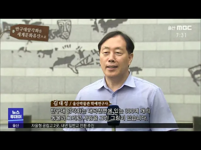 반구대 암각화는 대곡천변에 있는 300여 개의 동물과 그리고 사람을 그린 그림이 있습니다. 이 그림은 세계적으로 유례를 볼 수 없는 세계문화유산으로서 이렇게 울산을 대표하는 유적인데 이런 유적이 세계 문화유산으로 등재하기를바라고 또 기원합니다. 파이팅!