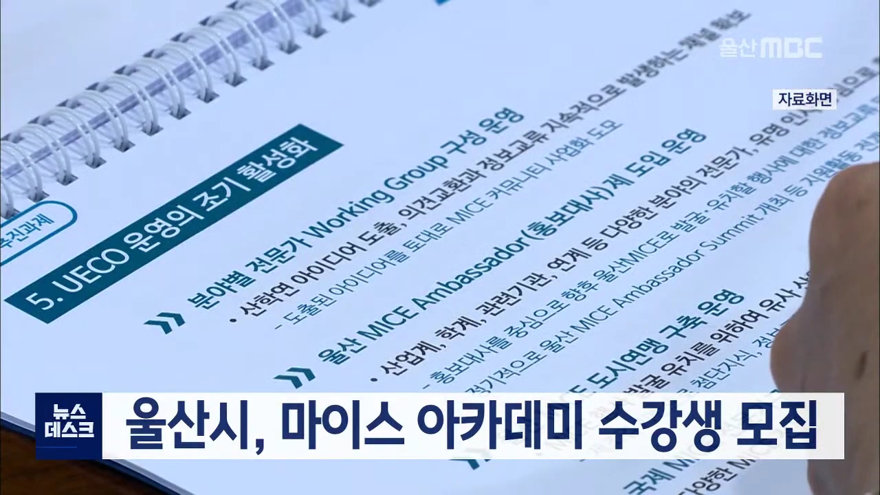 내년 울산전시컨벤션센터 개관을 앞두고 울산시가 마이스 전문가 양성을 위한 마이스 아카데미 수강생을 모집합니다. 교육은 이론과 실무, 특강 등 모두 3일 과정으로 운영됩니다. 다음달 12일까지 수강생을 모집하며, 마이스 산업에 관심이 있는 울산시민은 누구나 참여할 수 있습니다. //
