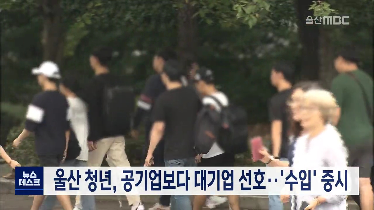 울산 청년들이 가장 선호하는 직장은 대기업이고, 직장 선택 기준에서는 수입을 가장 중시하는 것으로 조사됐습니다. 울산연구원 이재호 박사가 인용한 통계청 조사에 따르면 지난해 울산 청년들의 대기업 선호도는 32.1%로, 공기업 22.8%, 국가기관 17.3%보다 높았습니다. 울산을 제외한 전국 청년 선호 직장은 국가기관이...