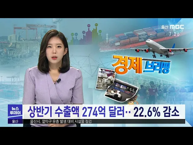 ◀ANC▶코로나19로 올해 상반기 울산지역 수출액이274억 달러에 그쳤습니다.올해 수출액이 5백어 달러에 머물 것이란우울한 전망이 나오고 있습니다.경제브리핑 서하경 기자 ◀VCR▶ ◀END▶코로나19가 장기화되면서올해 상반기 울산지역 수출액이274억 6천만 달러에 그쳤습니다.이는 지난해 상반기보다 22.6%가 줄어든...