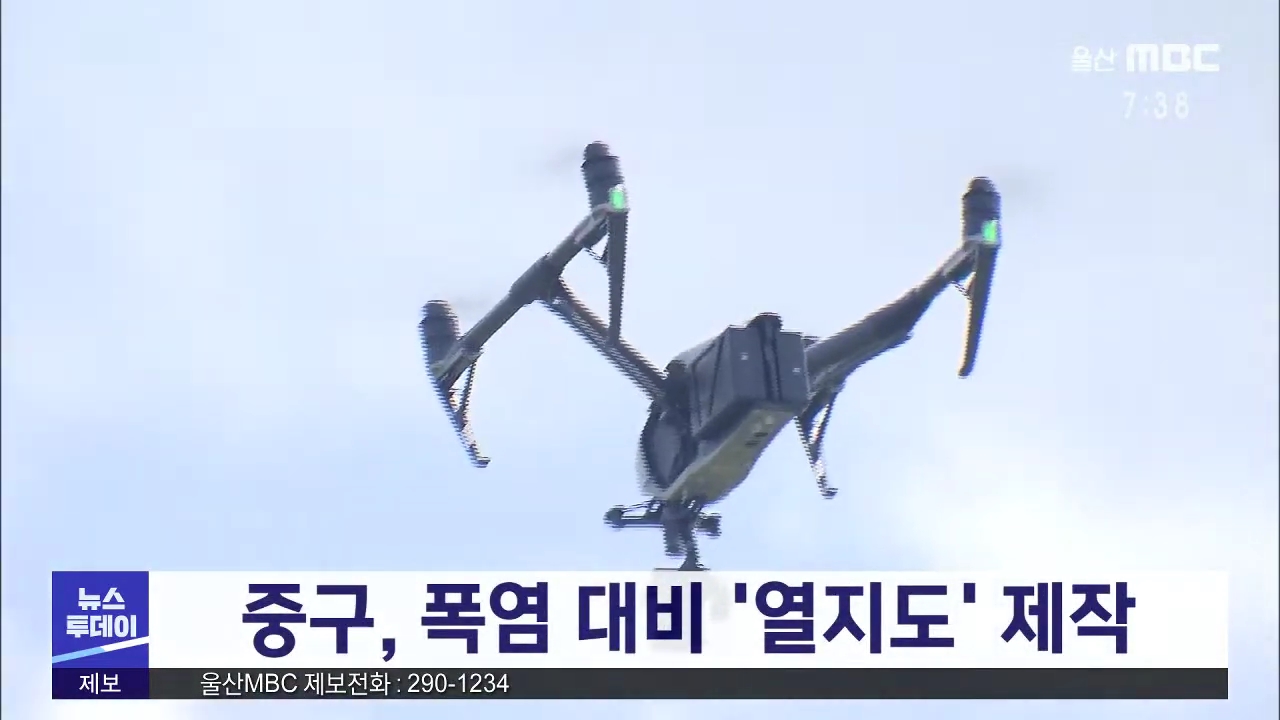 중구는 폭염에 대비하기 위해 유동 인구가 많은 곳을 중심으로 열 센서를 장착한 드론을 띄워 열지도를 제작합니다. 중구청은 지표면의 온도 분포와 변화를 시각화한 열지도를 토대로 그늘막 설치, 도로 살수 등 폭염 대책을 수립할 예정입니다. //