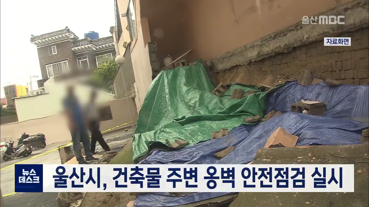 울산시와 각 구·군, 안전관리자문단이 여름철 집중 호우에 대비해 오는 24일까지 일주일 간 공동주택 등 건축물 주변 옹벽 10곳에 대해 합동 안전점검을 실시합니다. 주요 점검사항은 옹벽 균열과 배면 침하, 누수 배수시설의 관리 상태 등으로 위험 요소가 발견되면 정밀안전진단과 보수 보강 등을 추진합니다. //