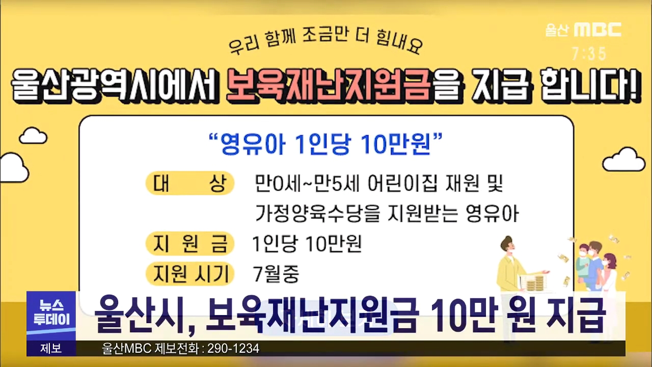 울산시는 내일(7/14) 보육재난지원금 10만원을 지급합니다. 지원 대상은 만5세 이하 어린이집을 다니거나 가정양육수당 영유아 4만4천352명입니다. 시는 기존 아동수당 지급계좌를 통해 현금으로 지급할 예정입니다. //