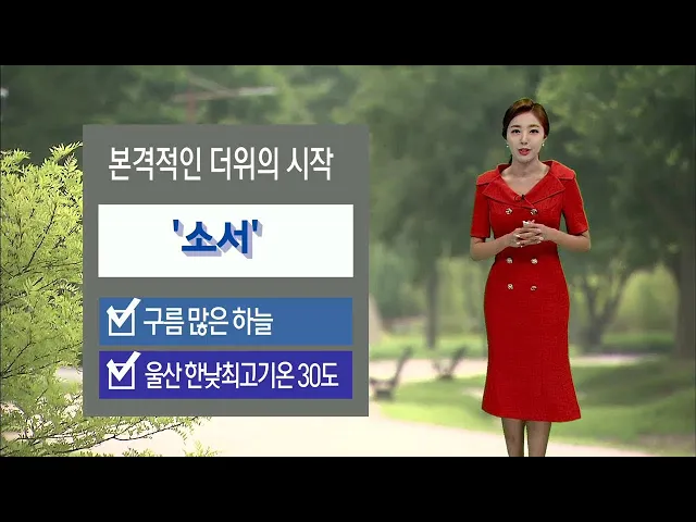 [절기 소서.. 울산 최고 30도]1) 본격적인 더위가 시작된다는 절기 소서인 오늘, 울산은 고기압의 영향으로 구름 많겠고, 한낮 기온은 30도까지 오르면서 덥겠는데요. 여기에 습도도 높아서 체감온도는 더 높을 것으로 예상됩니다. 농작물 피해 없도록 유의하셔야겠고, 더불어 건강관리 잘 해주셔야겠습니다.2) 오늘 아침까...