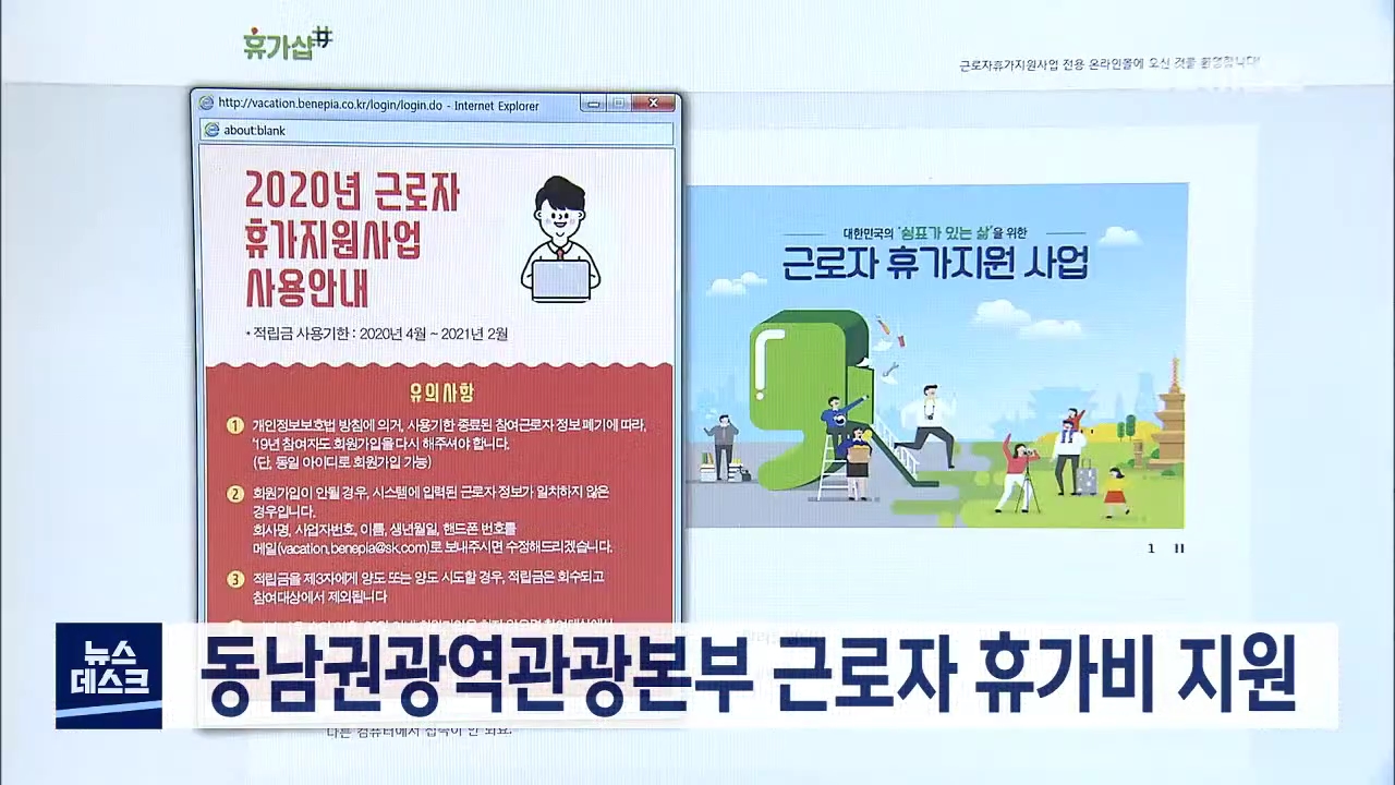 울산과 부산, 경남이 공동으로 운영하는 동남권광역관광본부가 근로자 휴가 지원사업에 나섭니다. 본부는 부·울·경 지역에서 관광을 즐기고 숙박하는 근로자에게 추첨을 통해 5만 원에서 최대 20만 원까지 지원할 계획입니다. 오는 6일부터 21일까지 근로자 휴가 지원 사업 전용 사이트를 통해 신청하면 됩니다. //
