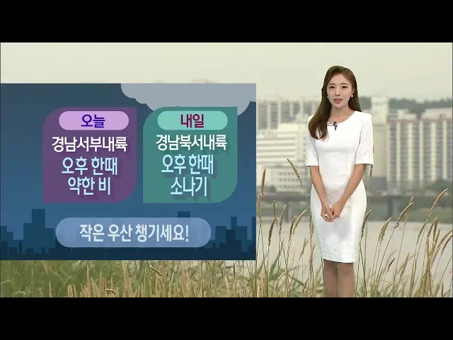 [구름 많음.. 일부 경남 내륙 빗방울]1) 울산은 새벽까지 약한 비가 내렸습니다. 현재 일부 경남 내륙으로도 산발적으로 약한 비나 빗방울이 떨어지는 곳이 있는데요. 오늘 울산은 낮 동안 구름만 많겠고 한낮 최고 기온 26도에 머물며 다소 선선하겠습니다.2) 오늘과 내일 일부 경남 내륙에 약한 비와 소나기 소식이 있습...