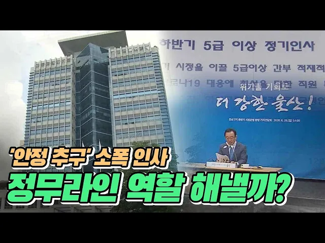 ◀ANC▶민선 7기 후반기 시작과 함께 울산시가 5급 이상 정기인사를 단행했습니다. 각 부서를 진두진휘하는 실·국장들의인사폭을 최소화해 변화보다는 안정을 택했다는 평가가 나오고 있습니다.후반기 정무라인 교체도 마무리되고 있는데, 전반기와 달리 이들이 어떤 역할을 해낼지 주목됩니다. 유영재 기자 ◀END▶ ◀V...