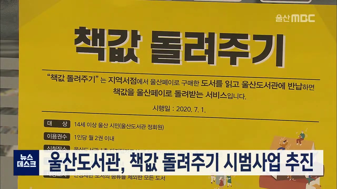 울산도서관이 내일부터(7/1) '책값 돌려주기 시범사업'을 실시합니다. 지역 서점에서 울산페이로 구입한 책을 읽고 4주 안에 울산도서관에 제출하면 구매금액 전액을 울산페이로 돌려받는 제도입니다. 울산도서관 홈페이지를 참고하면 신청 제한 도서와 구매 가능 지역 서점을 확인할 수 있습니다. //
