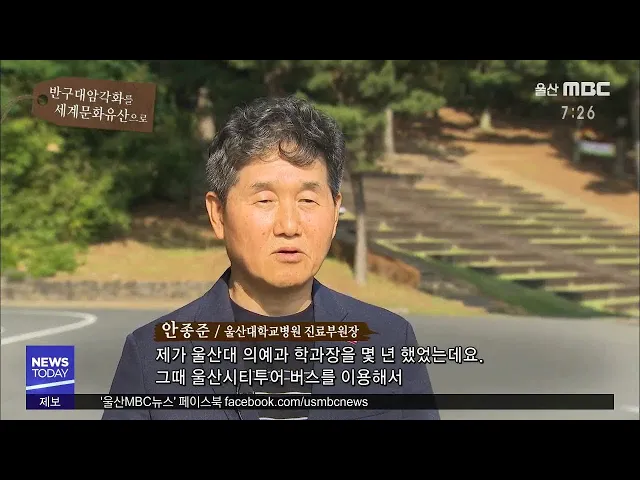 제가 울산대 의예과 학과장을 몇 년 했었는데요. 그때 울산시티투어 버스를 이용해서 반구대 암각화를 3년 정도 방문한 적이 있습니다. 그때 학생들한테 물어봤을 때 반구대 암각화를 모른다는 학생은 전혀 없었습니다. 하지만 반구대 암각화가 울산에 있다는 것은 아는 학생이 거의 없었습니다. 그때 많이 안타까웠었는데...