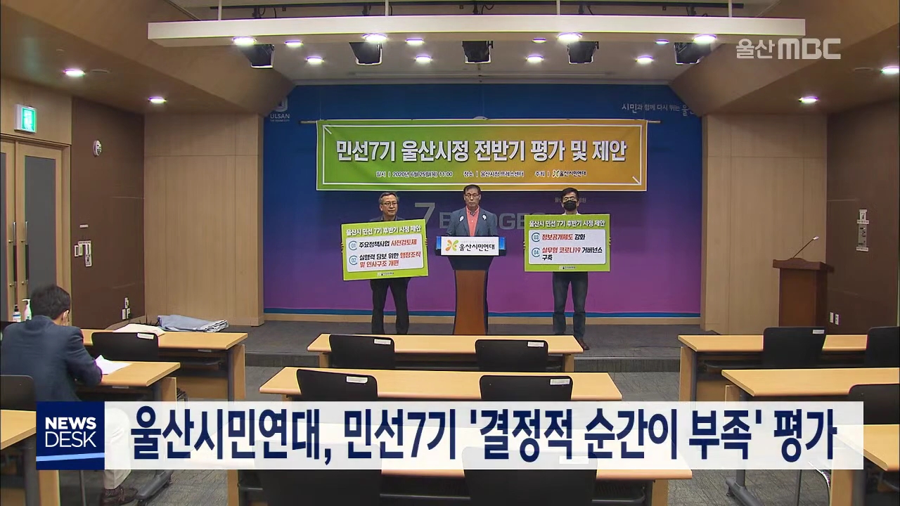 울산시민연대는 오늘(6/25) 시청에서 민선7기 울산시정 전반기 평가 기자회견을 갖고외곽순환도로 확정과 산재공공병원 건립,경제자유구역 유치 등 외적인 결과는나쁘지 않지만 단체장 평가에서는 하위권을벗어나지 못해 변화를 위한 기대에 부응해야 한다고 평가했습니다. 또, 초기 인사논란과 청와대 하명수사 논란,조선...