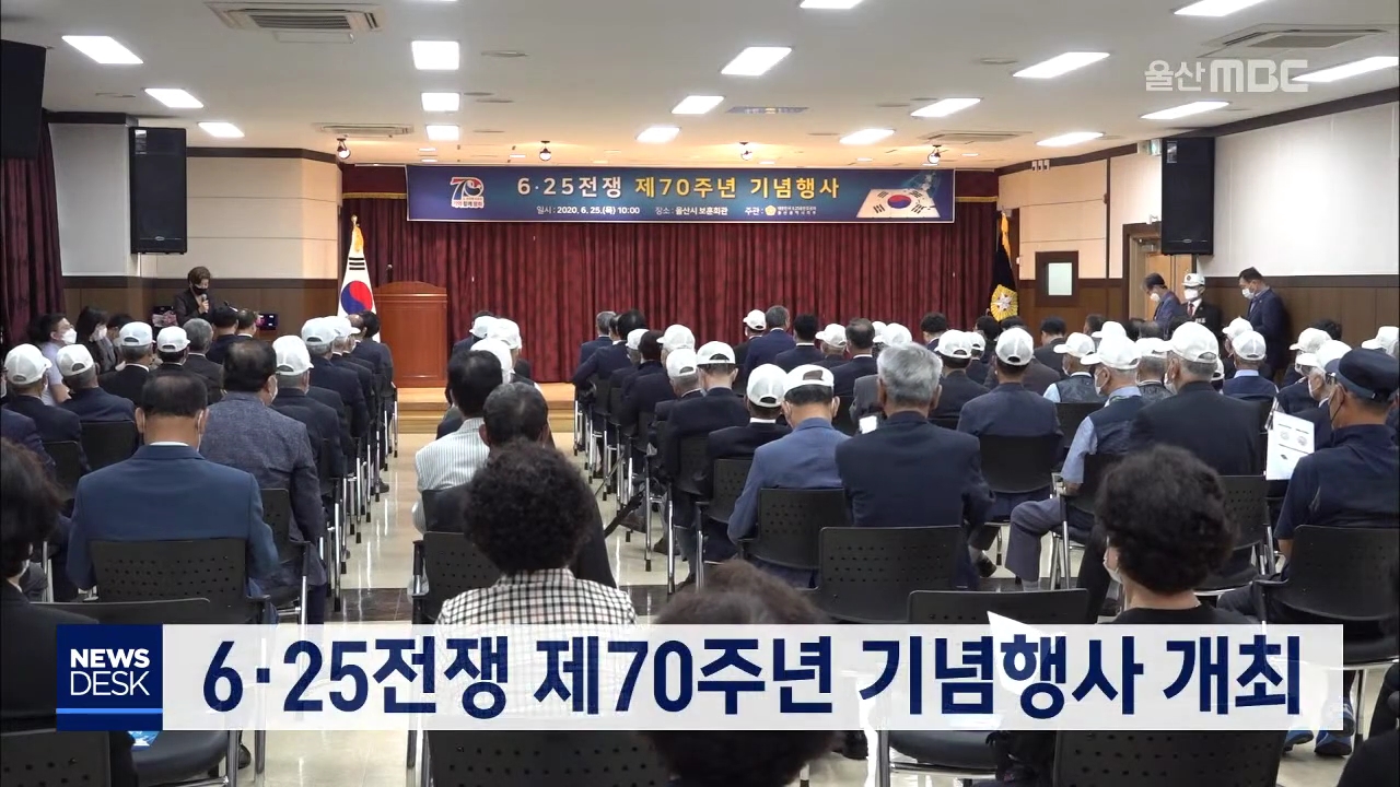6·25전쟁 제70주년 기념행사가 오늘(6/25) 중구 남외동 울산시 보훈회관에서 열렸습니다. 6·25참전유공자회 울산광역시지부 김용남 회원 등 13명이 울산광역시장 표창을 받았습니다. 울산시는 이번 행사가 참석하지 못한 참전용사에게는 자택을 방문해 직접 표창을 전달하기로 했습니다. //