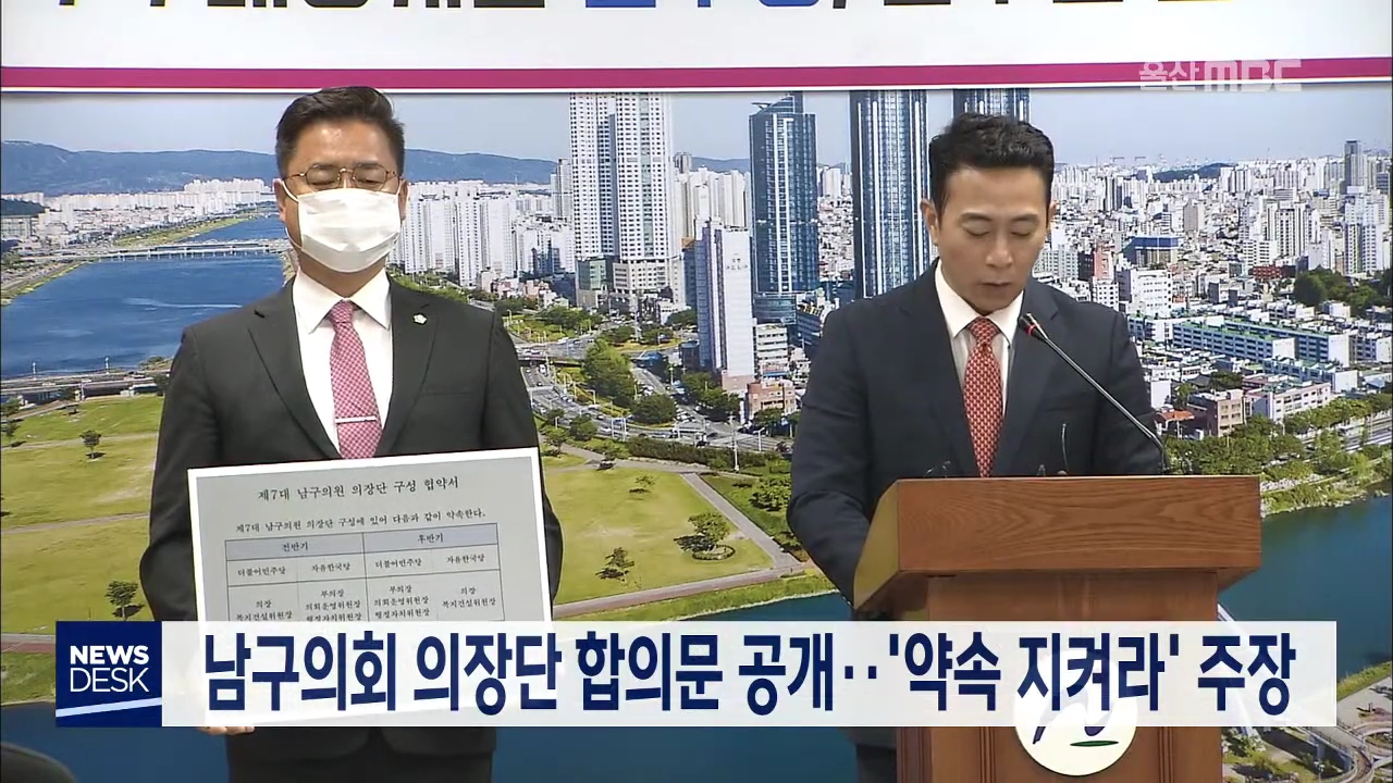 울산 남구의회 의원들이 후반기 원 구성을 두고 갈등을 빚는 가운데 미래통합당이 여야가 번갈아가며 의장단을 맡기로 했다는 합의문을 공개했습니다. 합의문에는 전반기는 민주당이, 후반기는 미래통합당이 의장을 맡는다는 내용이 담겼으며 남구의원 모두가 기명으로 서명했습니다. 이에대해 더불어민주당은 시급하게 처...