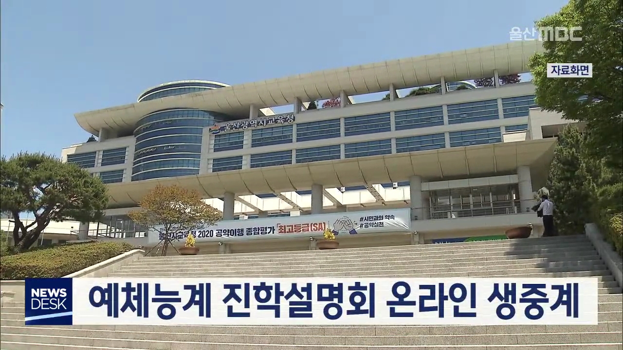 예체능계 학생을 위한 온라인 입시설명회가 오늘(6/20) 오전 9시부터 울산시교육청 SNS를 통해 생중계됐습니다. 시교육청은 코로나19 확산 우려 때문에 2021학년도 예체능계열 대학진학설명회를 온라인 강의로 대체했습니다. 강의는 시교육청 1층 울산진학정보센터에서 진행됐으며, 음악과 미술, 체육 분야 입시 전략과 계...