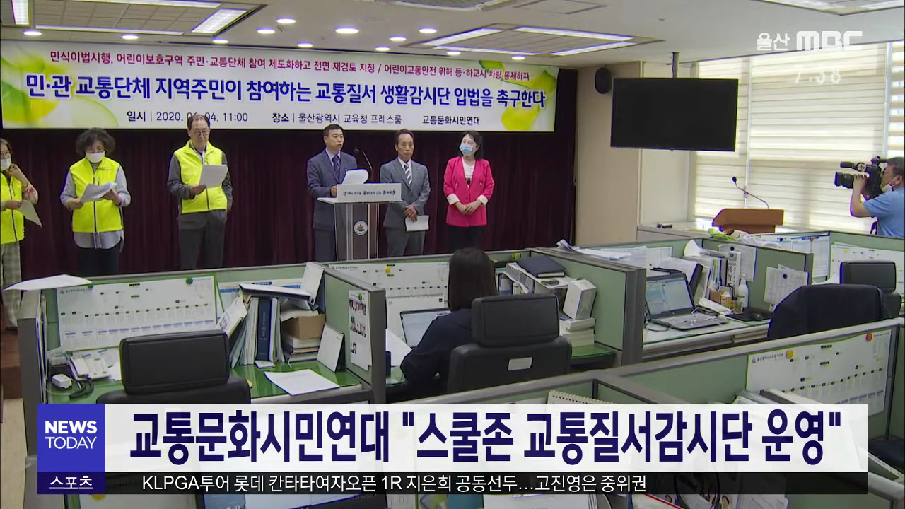 울산교통문화시민연대는 오늘(6/4) 시교육청에서 기자회견을 열고 민식이법 시행에 따른 스쿨존 교통질서감시단 운영에 대한 조례 제정을 촉구했습니다. 시민 누구나 자발적으로 참여할 수 있는 교통질서감시단은, 어린이 통학로 안전 확보에 필요한 불법주차 단속과 차량 통행 지도, 교통시설물 개선 등 다양한 활동을 할 ...