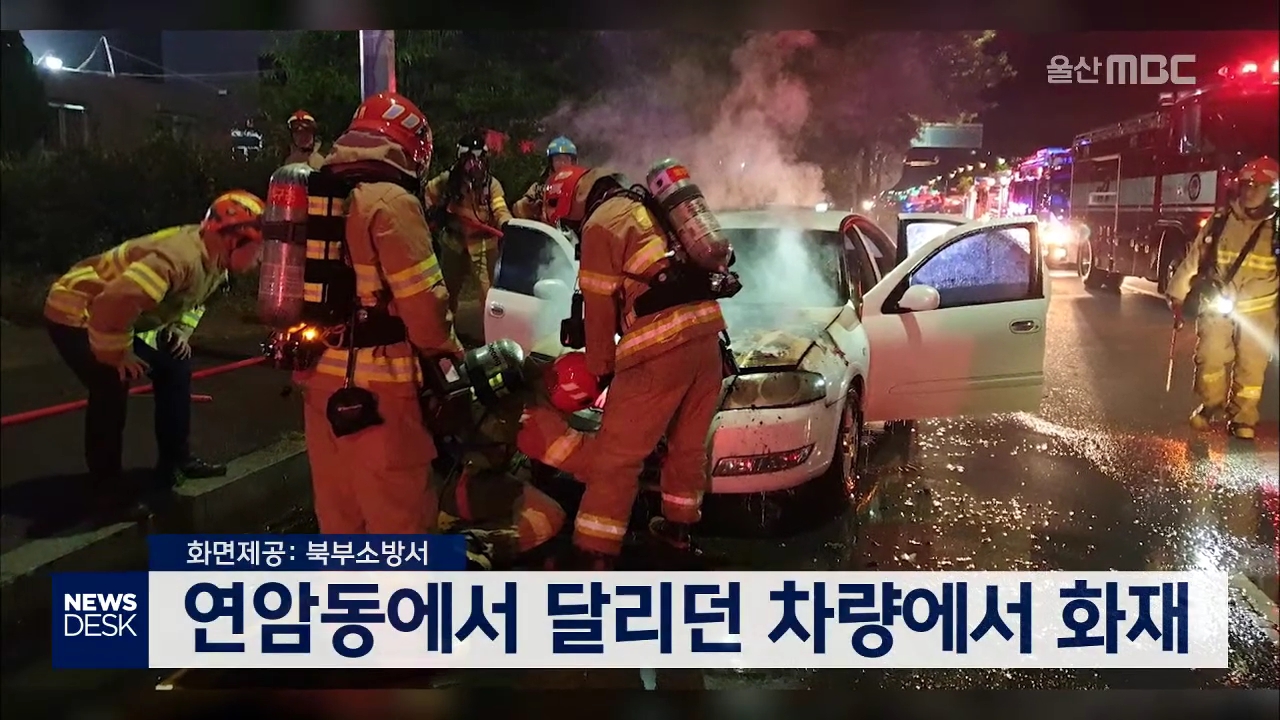 오늘(6/2) 새벽 4시 10분쯤 북구 연암동의 한 도로에서 43살 A씨가 몰던 승용차에서 불이 나 엔진룸을 모두 태워 소방서 추산 110만 원의 재산피해를 내고 12분만에 꺼졌습니다. 소방당국은 운전중 타는 냄새가 나기 시작했다는 A씨의 진술을 토대로 정확한 화재원인을 조사하고 있습니다.//