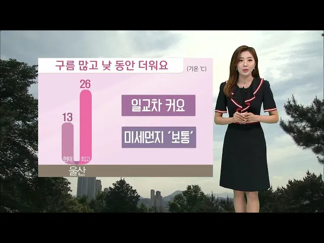 1) 서해안과 제주, 중부지방에 적은 양의 비 소식이 있지만 우리 지역은 오늘 구름만 많이 지나는 날씨가 이어지겠습니다. 현재 울산의 기온 13도를 나타내고 있는데요. 한낮에는 2배가량 기온이 올라 26도가 예상됩니다. 2) 울산은 오늘 자외선 지수가 매우 높습니다. 오전 10시부터 3시까지는 자외선이 매우 강한데요, 매...