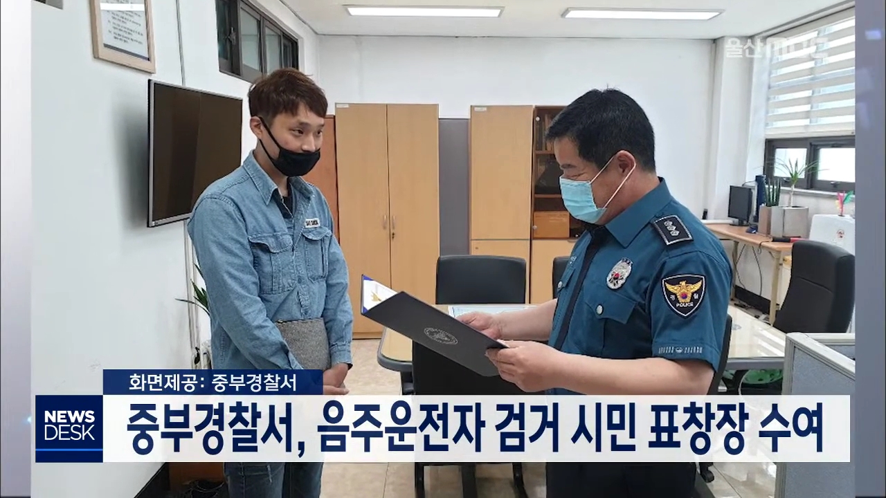울산중부경찰서는 음주운전 피의자 검거에 기여한 시민 A씨에게 표창장을 수여했다고 밝혔습니다. A씨는 지난 20일 새벽, 동구의 한 식당에서 술을 마시고 약 16km 구간을 만취 상태로 운전한 피의자를 추적하면서 경찰에 신고해 피의자 검거에 기여했습니다. //