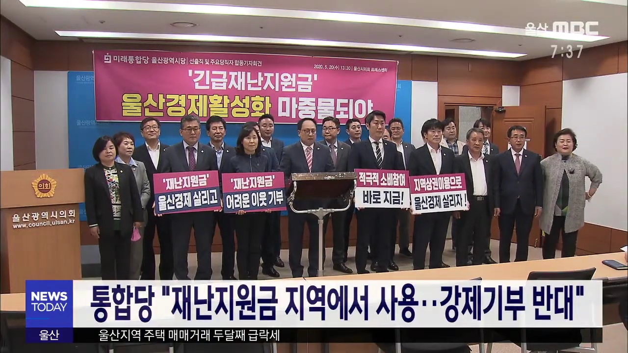 미래통합당 울산시당 선출직 당직자들은 오늘(5/20) 기자회견을 열고 긴급재난지원금으로 지역 상권에서 물품을 구입한 뒤 어려운 이웃에게 기부하겠다고 밝혔습니다. 이들은 긴급지난재원금의 지급 목적이 지역 경제 활성화와 중소상인 지원에 있는 만큼 정부가 기부를 강제해서는 안 된다며, 지원금을 취지에 맞게 지역에...