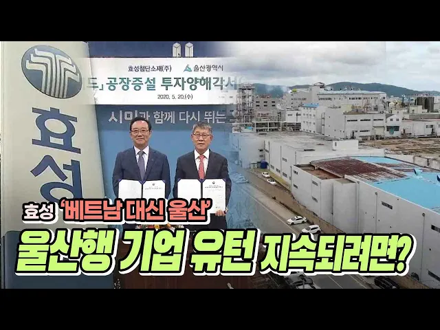 ◀ANC▶그동안 해외 진출에 열을 올리던기업들이 국내로 눈을 돌리기 시작했습니다.코로나19가 장기화되면서 비용 절감보다는안정적인 생산이 더 중요하다는인식 때문인데,대기업 유턴 1호인 현대모비스에 이어, 효성이 베트남 투자 계획을 접고 울산에 공장을 증설하기로 했습니다. 유영재 기자 ◀END▶ ◀VCR▶효성첨...