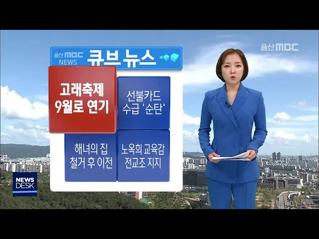 울산 남구와 고래문화재단은 오늘(5/20) 이사회를 열고다음달 열릴 예정이던 울산고래축제를9월로 연기하기로 했습니다.코로나19 확진자가 늘고 있고학생들이 순차 개학이 시작된 만큼방역과 주민 안전이 더 중요하다는판단에 따른 것입니다.고래축제는 오는 9월11일부터 13일까지로 중구 마두희 축제와 같은 시기에 열어시...