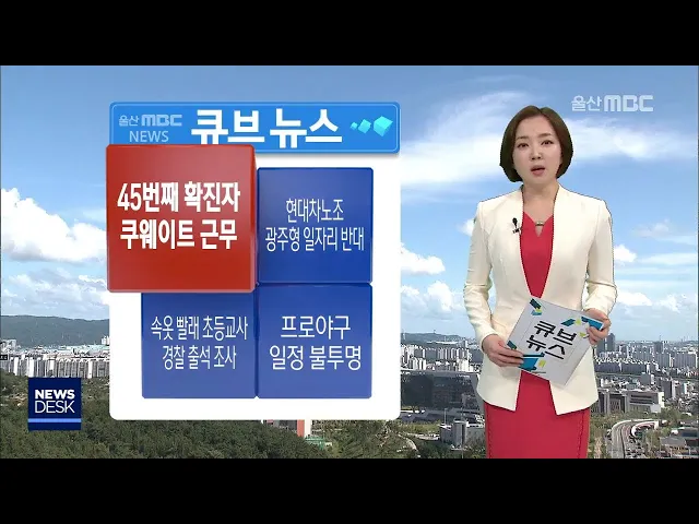 울산에서 45번째 코로나19 확진환자가 나왔습니다. 동구에 거주하는 41살 남성으로 A씨는 지난 2017년 2월부터 쿠웨이트에서 근무하다 최근 인천공항을 통해 귀국했습니다. 이 남성의 배우자, 자녀 2명은 모두 음성 판정을 받았습니다. 한편, 울산은 지난 3월 15일 이후 현재까지 국내 요인에 의한 감염 사례는 없는 상태입...