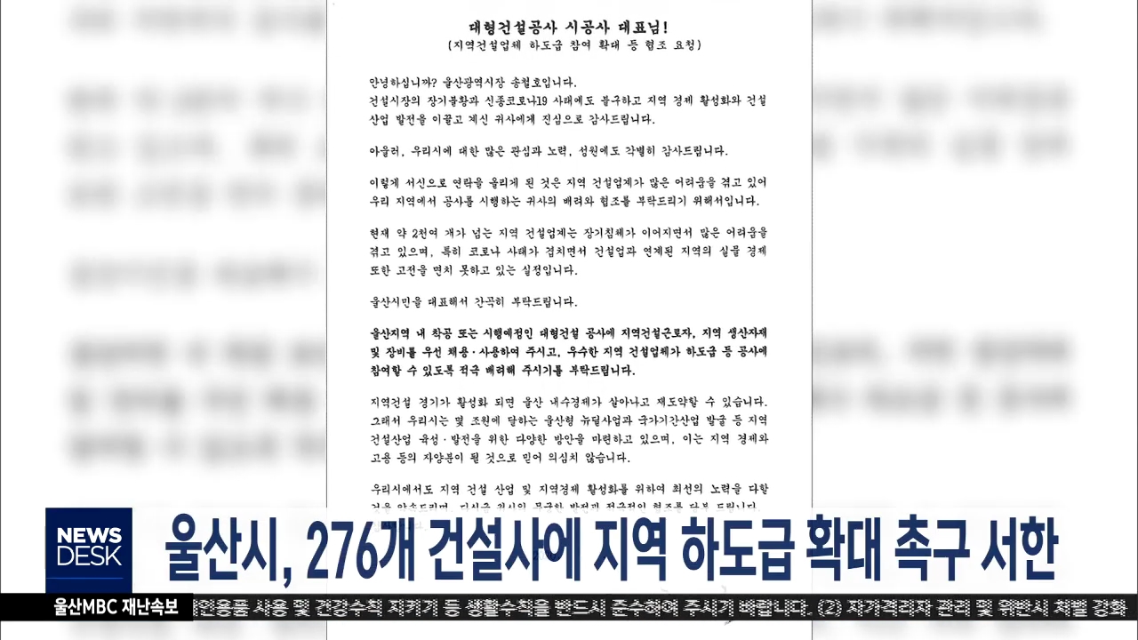 울산시는 오늘(5/11) 송철호 시장 명의로 GS건설을 포함한 지역에서 공사 중인 건설사 276곳 대표에게 지역 건설사를 하도급에 많이 참여시킬 것을 요청하는 서한문을 전달했습니다. 송 시장은 서한문에서 현재 2천여 개 넘는 지역 건설사가 코로나19와 건설경기 장기 침체로 많은 어려움을 겪고 있다며 지역 건설사의 하도...
