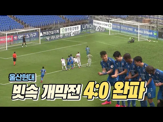 ◀ANC▶프로축구 울산 현대가 빗속에서 치러진홈 개막전에서 상주 상무를 4대 0으로 대파하고 우승 후보다운 막강 전력을 과시했습니다.홈 팬들은 응원 문구를 담은 대형 현수막을미리 관중석에 설치하며,경기를 직접 보지 못한 아쉬움을 달랬습니다.정인곤 기자. ◀END▶ ◀VCR▶지난 시즌 리그정상 탈환을 눈 앞에 두...
