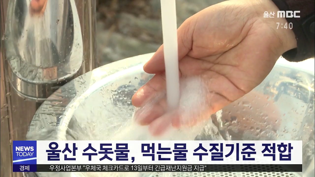 울산지역 수돗물이 먹는물 수질기준에 적합한 것으로 나타났습니다. 울산시 상수도사업본부가 이번 달 실시한 60개 항목 수질검사 결과 잔류염소는 리터당 4mg인 기준치보다 적은 0.25mg이 검출됐고 일반세균과 대장균 등 7개 항목도 검출되지 않거나 기준치 이하인 것으로 나타났습니다.