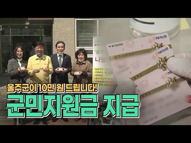 ◀ANC▶울산에서는 처음으로 울주군이 오늘(4/28)부터 1인당 10만 원씩 긴급 지원금을 지급했습니다.소득 수준에 상관없이 누구나 받는 지원금이어서,더 어려운 이웃을 위해지원금을 기부하자는 캠페인도 함께 시작됐습니다.유희정 기자. ◀END▶ ◀VCR▶울주군 청량읍의 한 아파트.관리사무소 앞에 출장소가 설치되자...