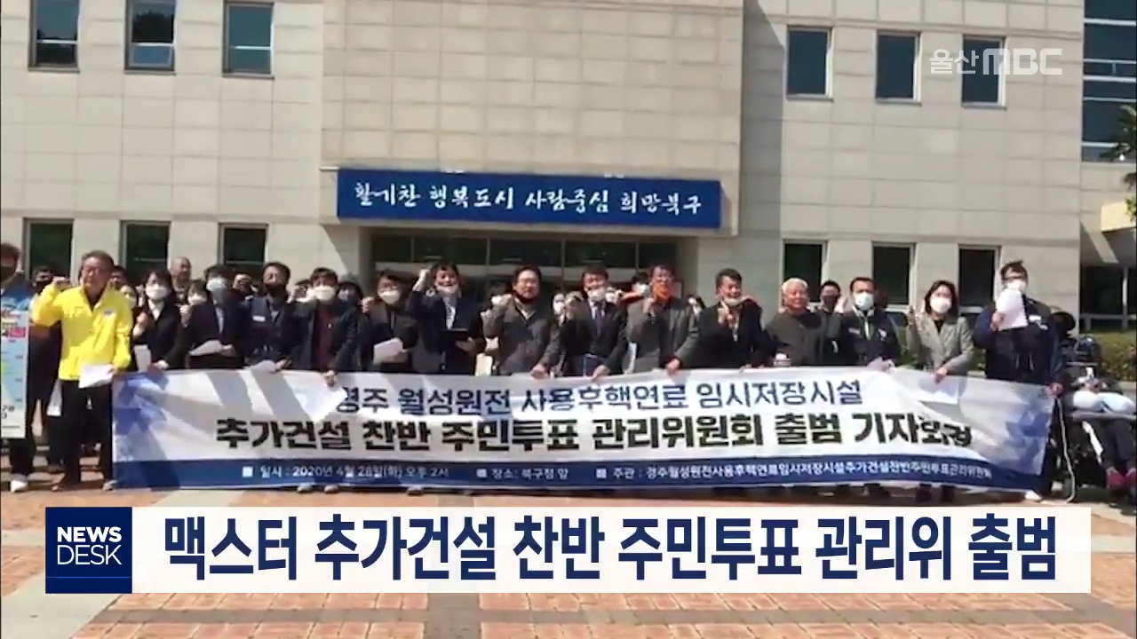 월성원전 사용후핵연료 임시저장시설인 맥스터 추가 건설 찬반 주민투표 관리위원회가 오늘(4/28) 북구청에서 출범식을 가졌습니다. 이들은 울산시민도 맥스터 건설의 직접 당사자임을 강조하면서 자체 찬반여부를 묻는 주민투표를 실시하겠다고 밝혔습니다. 북구는 월성원전으로부터 7km 떨어져 있지만 맥스터 추가건설과 ...