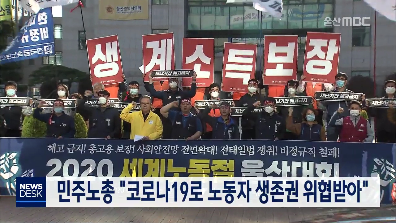 민주노총 울산본부는 코로나19 확산으로 노동자와 취약계층이 생존을 위협받는 처지에 놓여 있다며, 정부와 지자체가 고용 안정과 분배정책 확대에 적극 나서라고 요구했습니다. 이들은 오늘(4/28) 개최한 노동절 기념대회에서, 코로나19 확산으로 닥친 경제 위기가 대규모 해고와 고용 불안으로 이어지며 노동자들의 생존...