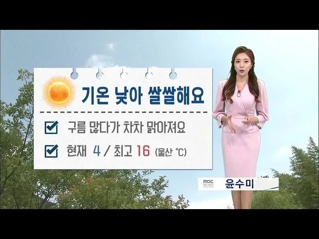 [기온 낮아 쌀쌀.. 대기 매우 건조]1) 어제 바람이 봄날을 시샘하듯 전국에 강풍이 이어졌습니다. 울산에 내려진 강풍주의보는 해제가 됐지만, 북서쪽에서 찬 공기가 유입되면서 오늘은 기온이 낮아 쌀쌀하겠습니다. 경남 일부 내륙에는 아침 최처기온이 0도 이하로 떨어지는 곳이 있어 따뜻한 옷차림 하셔야겠습니다. 현재...