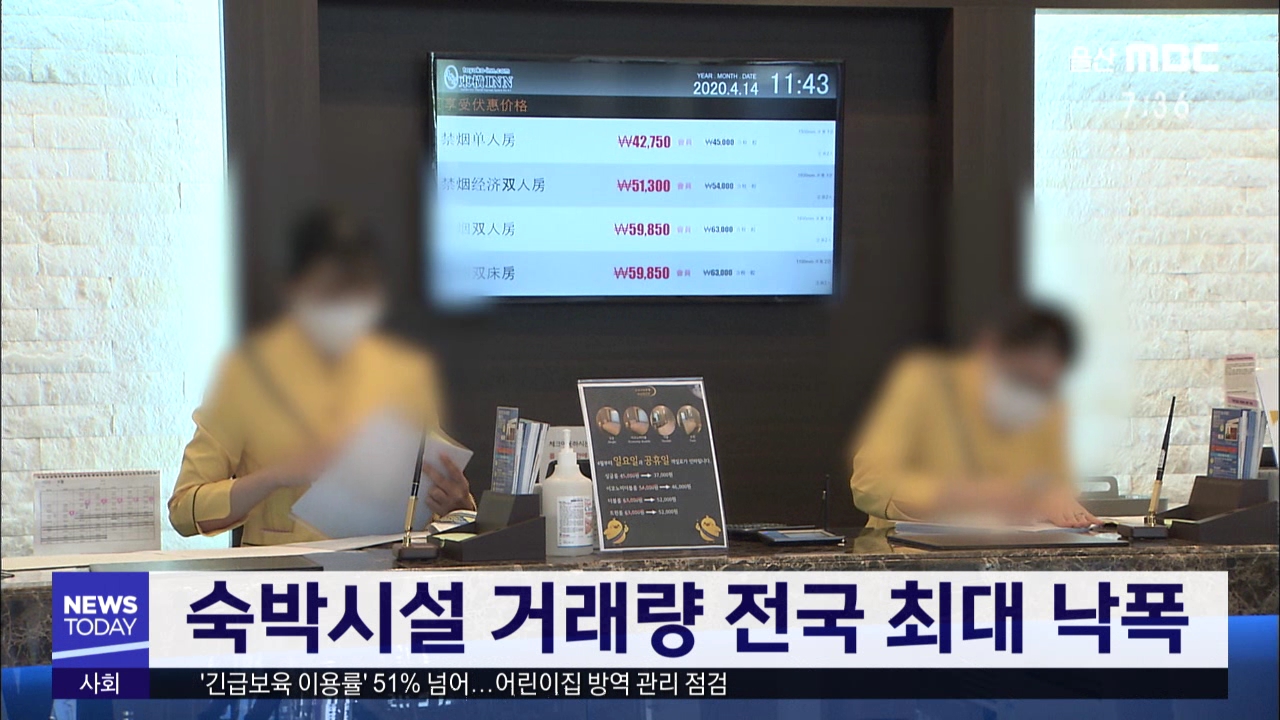 올해 1분기 울산지역 숙박시설 거래량이 전국 최대 낙폭을 기록했습니다. 올해 1분기 울산지역 숙박시설 거래량은 코로나 19 등의 영향으로 지난해 같은 기간보다 82% 감소한 2건에 불과한 것으로 조사됐습니다. 울산 다음으로 인천이 47%, 광주가 21%, 서울이 18% 감소했습니다.