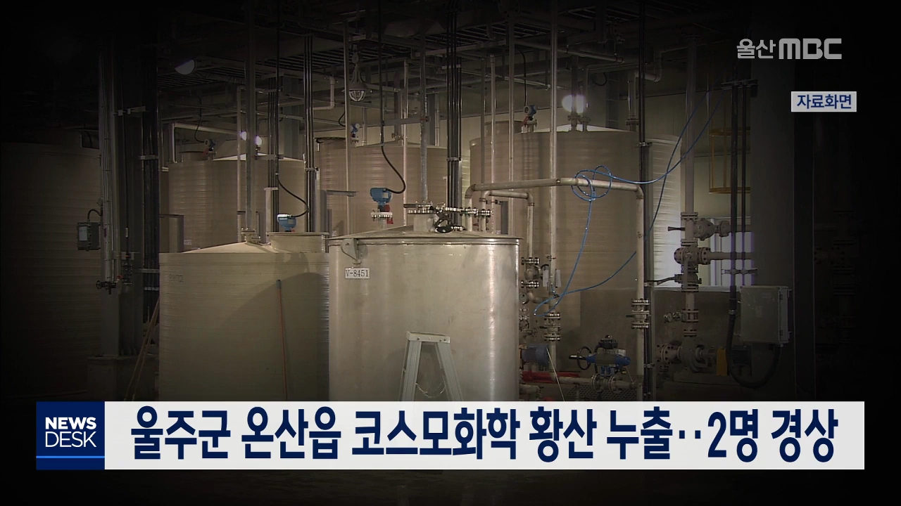 오늘(4/20) 오후 2시쯤 울주군 온산읍 코스모화학 온산공장에서 황산이 누출되는 사고가 발생했습니다. 이 사고로 극소량의 황산이 튀며 근로자 2명이 얼굴 부위에 화상을 입고 병원으로 이송됐습니다. 소방당국은 가동이 중단된 공장에서 황산을 투입하는 밸브 교체 작업을 하다 사고가 발생한 것으로 보고 정확한 경위를 ...