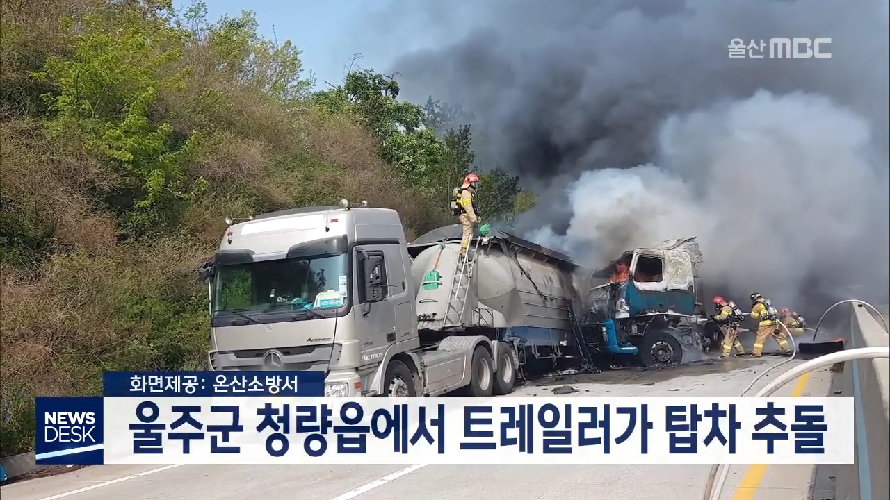 오늘(4/20) 오후 3시쯤 울주군 청량읍의 한 도로에서 20t 트레일러가 25t 탑차를 추돌했습니다. 이 사고로 트레일러 운전자 70살 오모 씨가 다쳐 병원으로 이송됐으며, 트레일러에서 화재가 발생해 출동한 소방대에 의해 20분 만에 꺼졌습니다. 경찰은 차량 운전자들을 상대로 정확한 사고 경위를 조사하고 있습니다.//