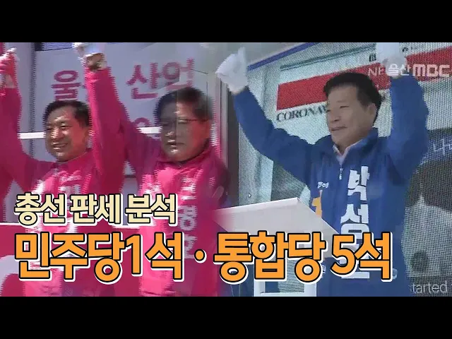 ◀ANC▶이제 선거일이 이틀(하루) 앞으로 다가왔는데요, 여야 정당은 이번 선거 결과를 어떻게 분석할까요.더불어민주당은 최소 1석, 미래통합당은 5석 이상 차지할거라고 전망했습니다.최지호 기자.◀END▶◀VCR▶더불어민주당은 울산 6개 선거구 가운데 북구를 우세지역으로 분석했습니다.이상헌 후보의 당선 가능성...