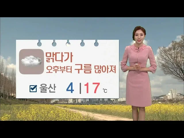 [오후부터 구름 많음.. 대기 매우 건조]1) 연일 맑은 날씨가 이어지고 있습니다.오늘 울산은 맑다가 오후부터 구름이 많아지겠고, 바람도 약간 강하게 불어 조금은 서늘하게 느껴지실 수도 있겠습니다. 울산의 아침 기온 4도로 출발해 한낮에는 17도까지 올라 일교차가 크겠습니다. 나오실 때 아침저녁으로 입고 벗기 쉬운 ...