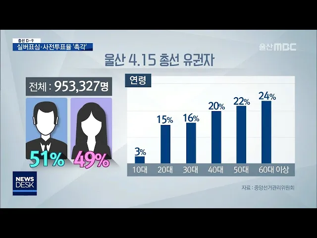 ◀ANC▶이번 총선 울산지역 유권자는 4년 전보다1만6천여 명 늘어났는데, 60대 이상 유권자비율이 가장 높게 나타났습니다.투표율과 함께 이른바 실버세대 표심의 향방이 변수가 될 것으로 전망되는데, 오는 10일 사전투표 결과가 우선 주목됩니다.최지호 기자입니다. ◀END▶ ◀VCR▶4.15 총선 울산지역 유권자는 95만...