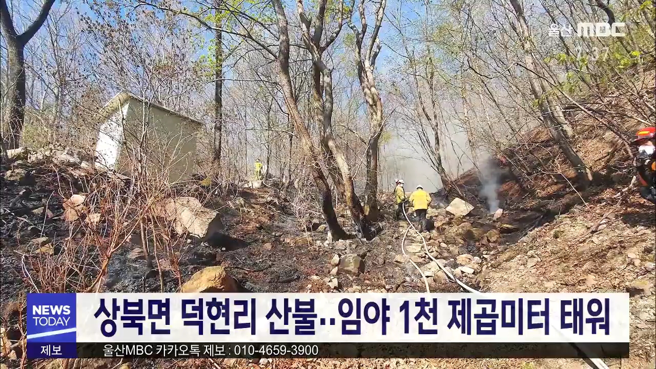 어제(4/5) 오후 3시 20분쯤 울주군 상북면 덕현리 마을 인근 야산에서 불이나 임야 천 제곱미터를 태우고 한 시간만에 진화됐습니다. 경찰과 소방당국은 마을에서 공동으로 사용하는 지하수 저장 탱크 부근에서 불이 시작됐다는 주민들의 진술을 토대로 정확한 화재원인을 조사하고 있습니다.